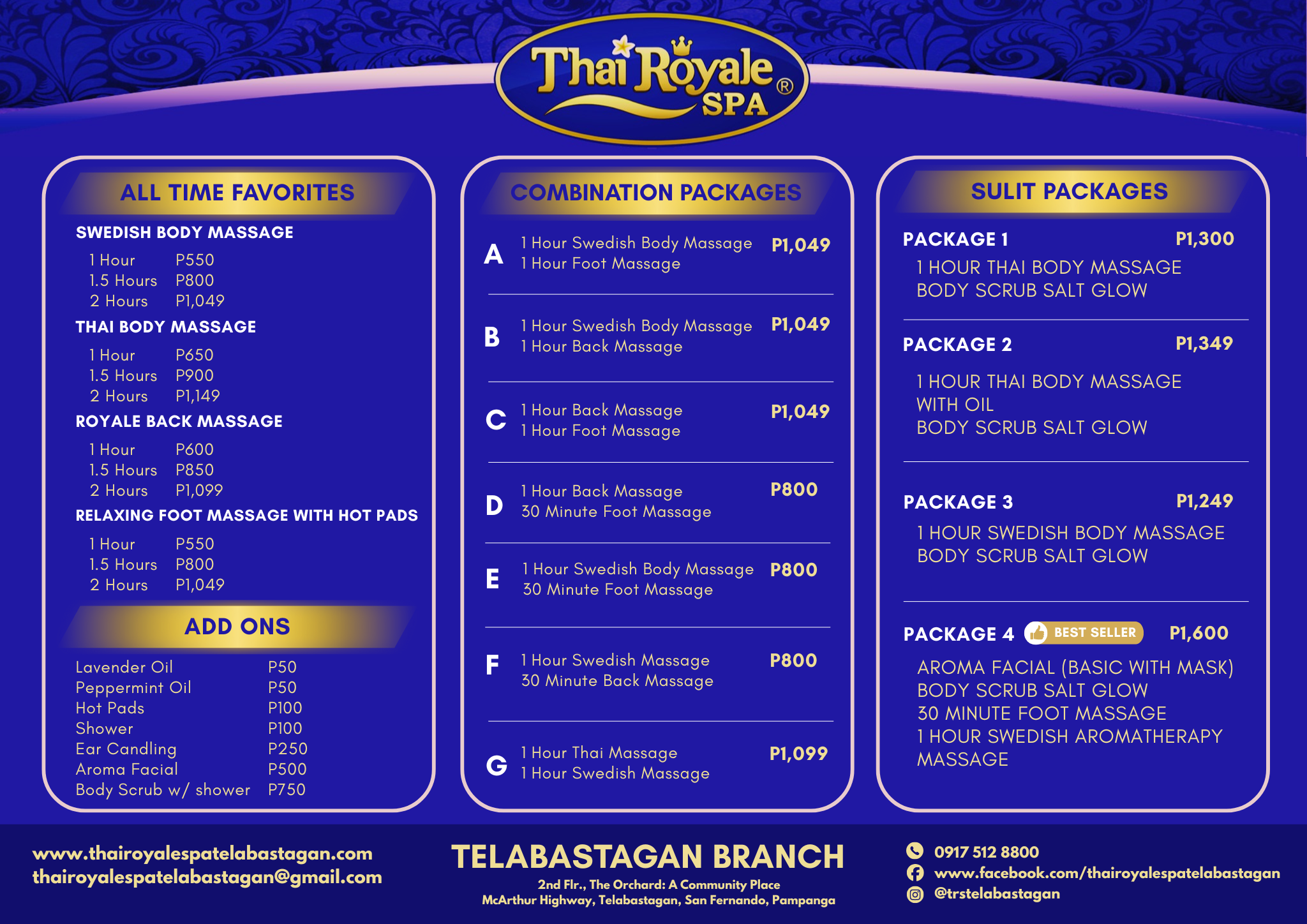 Thai Royale Spa Telabastagan is owned by Regner and Bea Garcia. It was their dream to provide comfort and relaxation through massage in this part of Pampanga. Now their dream became a reality, it is their vision to be the best massage spa in Pampanga and their mission is to provide the best massage to Kapampangans and to all Filipinos. They believe that the secret to a successful massage spa business is to provide only the best massage from the skillful hands of well-trained massage therapists.
